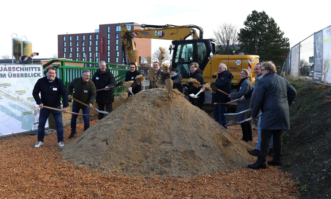 Vertreter aus Politik und Verwaltung – darunter Baudezernent Andreas Eickmann, Bürgermeister Thomas Brunken, Bundestagsabgeordneter Christoph Frauenpreiß und der Vorsitzende des Bauausschusses Enak Ferlemann – stimmten die Gäste in ihren Ansprachen auf das Projekt ein, bevor gemeinsam der symbolische Spatenstich erfolgte.