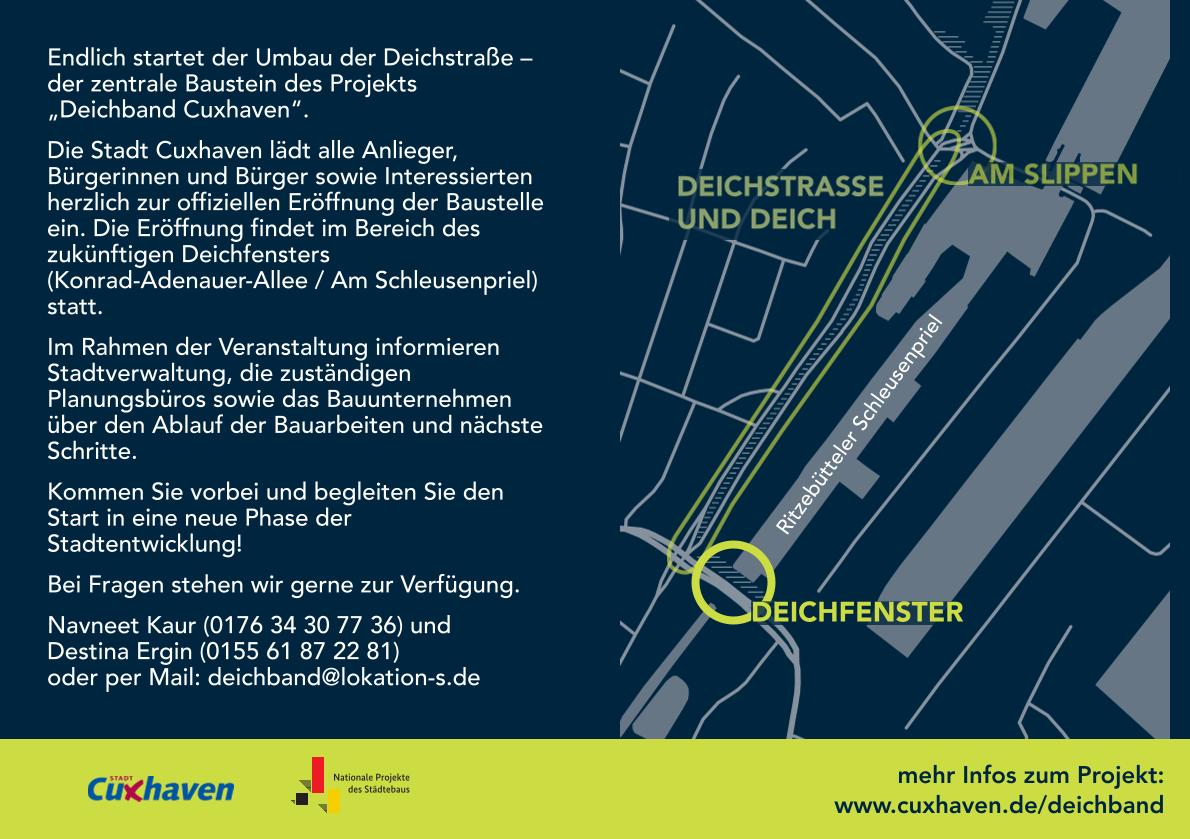 Mit dem Umbau der Deichstraße beginnt in Cuxhaven ein zentrales Zukunftsprojekt: Die Stadt startet offiziell den Bau des neuen „Deichbands Cuxhaven“ – einem wichtigen Baustein für die städtebauliche Weiterentwicklung und die Attraktivierung der Innenstadt. Der feierliche Spatenstich findet am Samstag, 13. Dezember 2025, ab 12 Uhr am zukünftigen Deichfenster (Konrad-Adenauer-Allee/Am Schleusenpriel) statt. Die Stadt lädt alle Anliegerinnen und Anlieger sowie Bürgerinnen, Bürger und Interessierten herzlich zur Teilnahme ein.