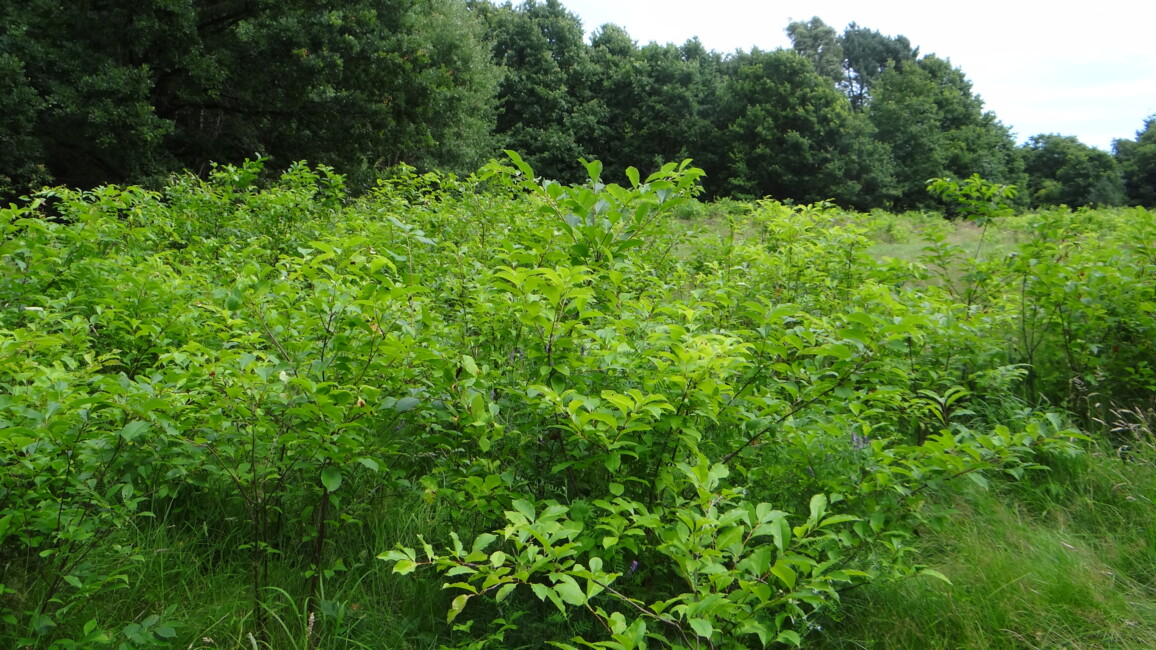 Die Spätblühende Traubenkirsche kommt ursprünglich aus Amerika. In Deutschland ist diese dominante Art sehr weit verbreitet - eingebracht auch durch die gezielte Anpflanzung seit 1900 als Wind- und Feuerschutz sowie zur Bodenverbesserung, insbesondere auf armen Sandböden. Mit Ausbreitung durch Vögel und Säugetiere dringt sie auch in die geschützten Offenlandbiotope und verändert dort die Artenzusammensetzung sowie das Landschaftsbild. Für große Teile des Naturschutzgebietes bedeutet dies, dass eine stetige Bekämpfung der Traubenkirsche erfolgen muss.