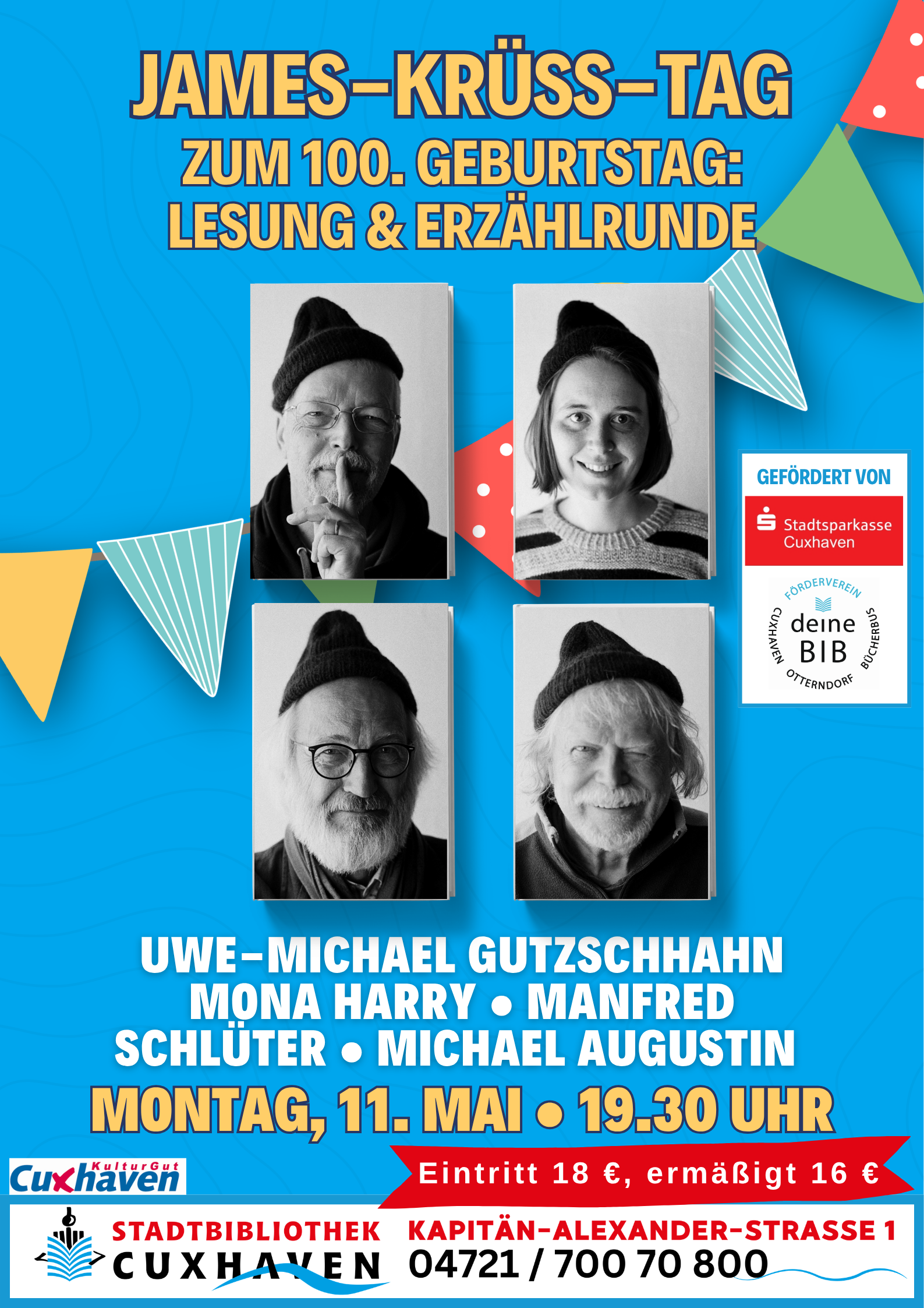 Im Mai dieses Jahres wäre der große Helgoländer Dichter James Krüss 100 Jahre alt geworden – ein wunderbarer Anlass für einen Tag voller Poesie und Wortspiel. Deshalb richtet die Stadtbibliothek Cuxhaven am Montag, den 11. Mai einen vielseitigen James-Krüss-Tag aus: um 19.30 Uhr lädt das Bibliotheks-Team zu einer Premierenlesung für Erwachsene aus dem gerade erschienenen Buch „Gedi, Geda, Gedichte“ ein, das während eines Dichter-Treffens auf Einladung der Krüss-Erbengemeinschaft auf der Hochseeinsel Helgoland entstanden ist. Mit gleich vier Kreativschaffenden im Boot erwartet Interessierte nicht nur eine Premierenlesung, sondern auch ein kurzweiliger Abend. Wir freuen uns auf den Neu-Cuxhavener Lyriker, Übersetzer und mehrfachen Jugendbuchpreisträger Uwe-Michael Gutzschhahn, auf die Poetry Slammerin, Autorin und Illustratorin Mona Harry, die besonders in Norddeutschland für ihr „Liebesgedicht an den Norden“ bekannt ist, auf Manfred Schlüter, der als Illustrator und freier Künstler bereits für Michael Ende und Boy Lornsen illustriert hat und mit seinen Kindergedichten überall in Schulen unterwegs ist, sowie auf den Schriftsteller und Übersetzer Michael Augustin, den Gründer des Kieler Literaturtelefons und des internationalen Lyrikfestivals „Poetry on the Road“ in Bremen.