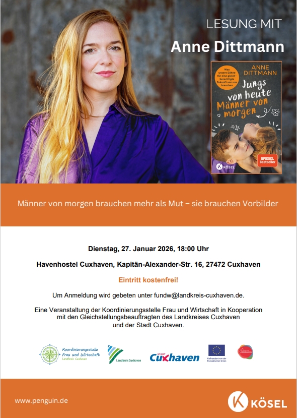 Die Lesung ist kostenfrei und findet in Kooperation mit der Gleichstellungsbeauftragten des Landkreises Cuxhaven sowie der Gleichstellungsbeauftragten der Stadt Cuxhaven statt