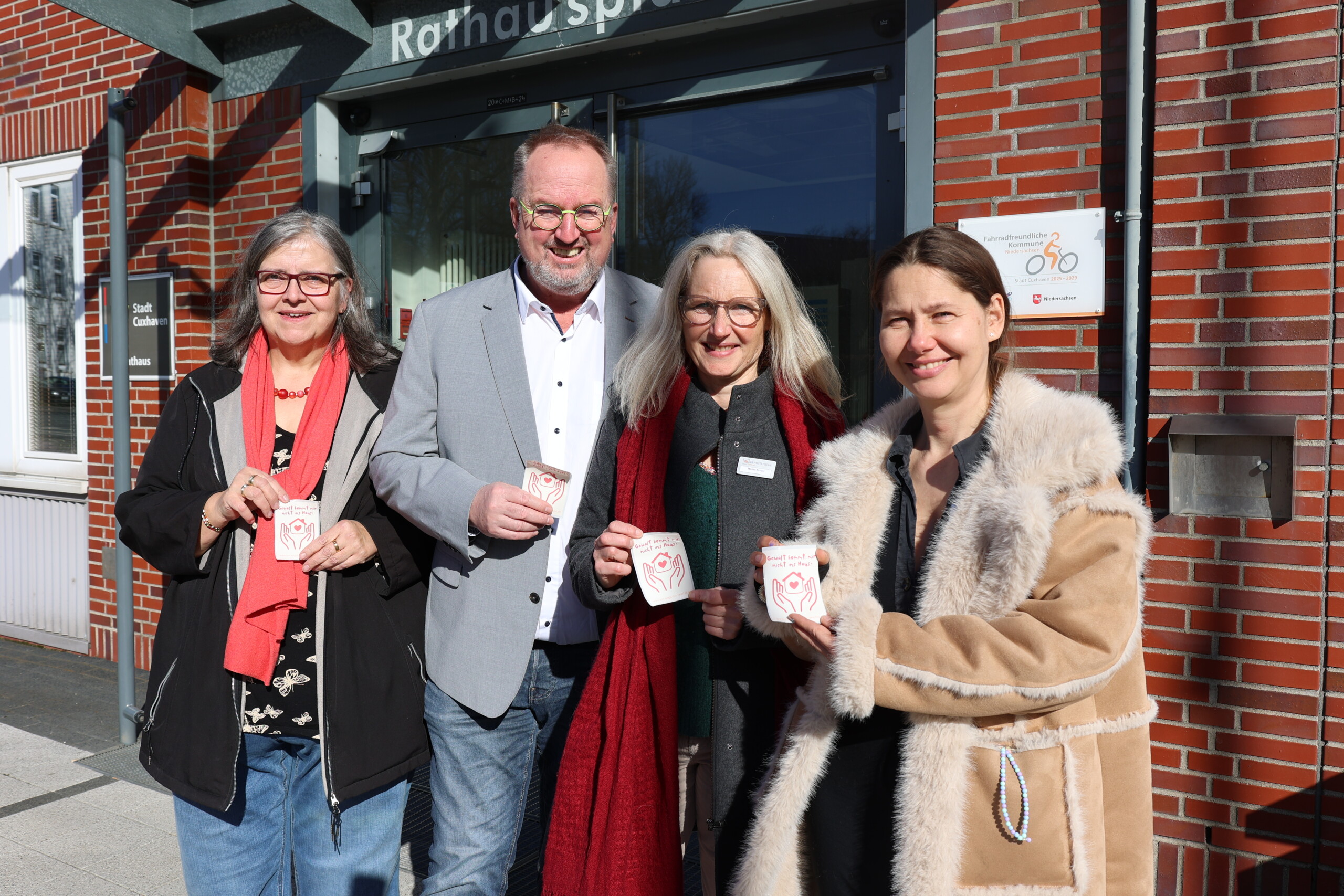 Heike Bach (Stadt Cuxhaven) und Oberbürgermeister Uwe Santjer brachten gemeinsam mit Marian Breuer und Mariana Härtel (Der Paritätische Cuxhaven) die Aufkleber am Rathaus an. Foto: Stadt Cuxhaven