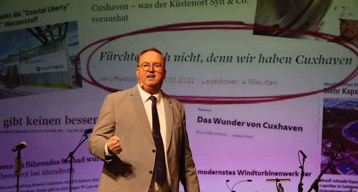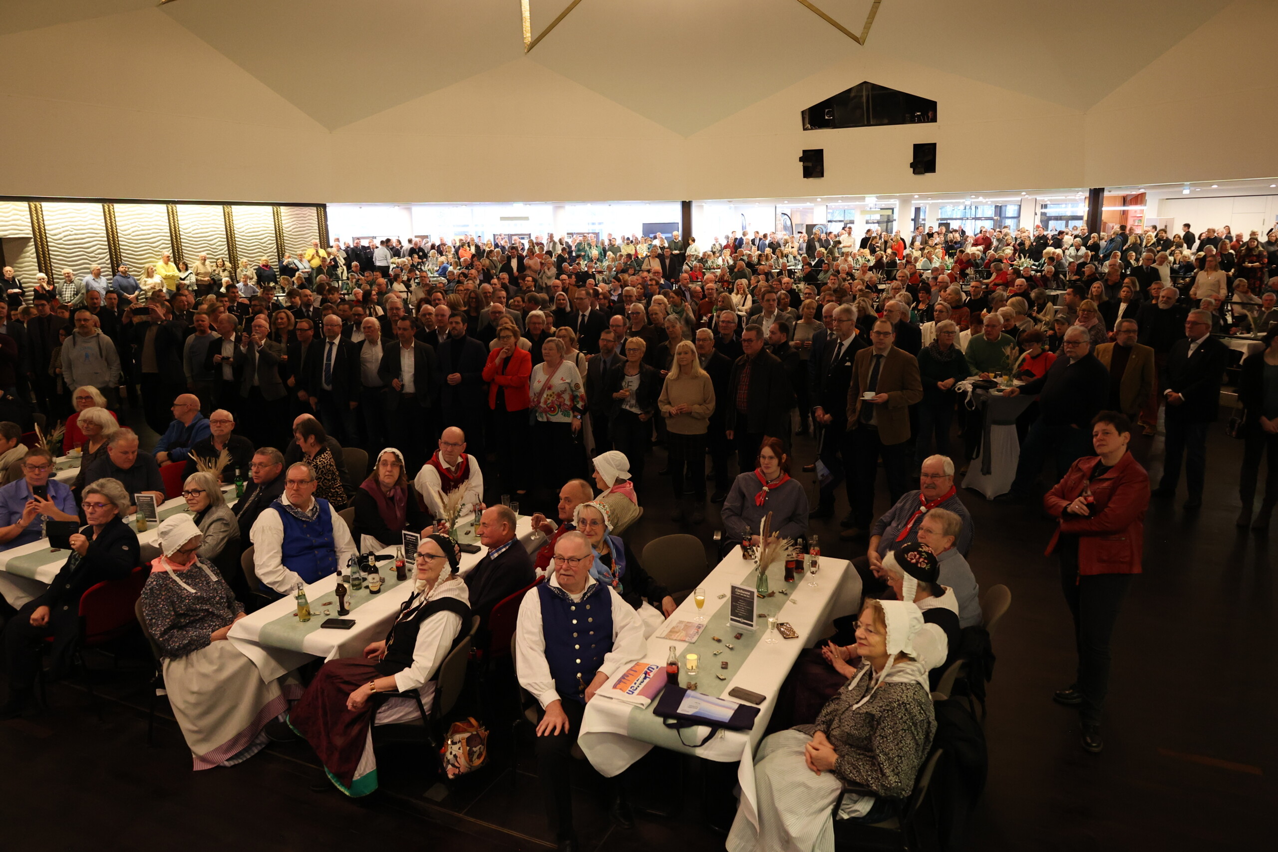 Bei der Ansprache von Cuxhavens Oberbürgermeister Uwe Santjer folgen mehr als 900 Menschen aus Vereinen, Organisationen, Wirtschaft, Politik, Nachbarschaft und weiteren Bereichen den Worten des Stadtoberhauptes in der Kugelbake-Halle. Foto: Stadt Cuxhaven