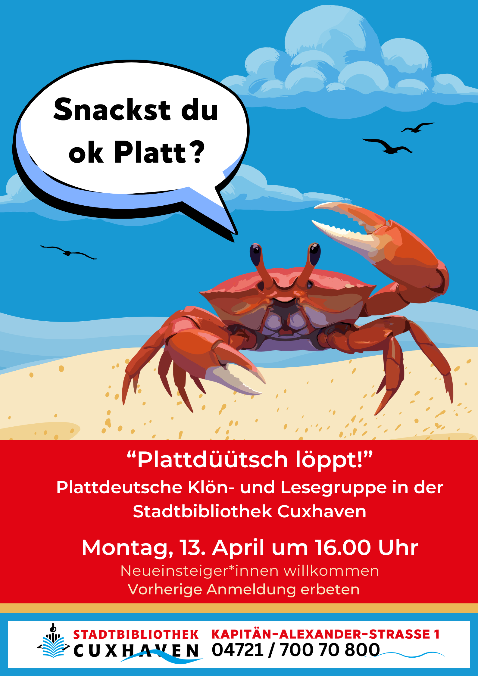 Wedder op Platt geklönt wird unter dem Titel „Plattdüütsch löppt!“ am Montag, den 13. April um 16 Uhr in der Stadtbibliothek Cuxhaven. Das Treffen für alle Plattdüütsch-Schnacker (und für die, die es noch werden wollen) steht jedem offen.