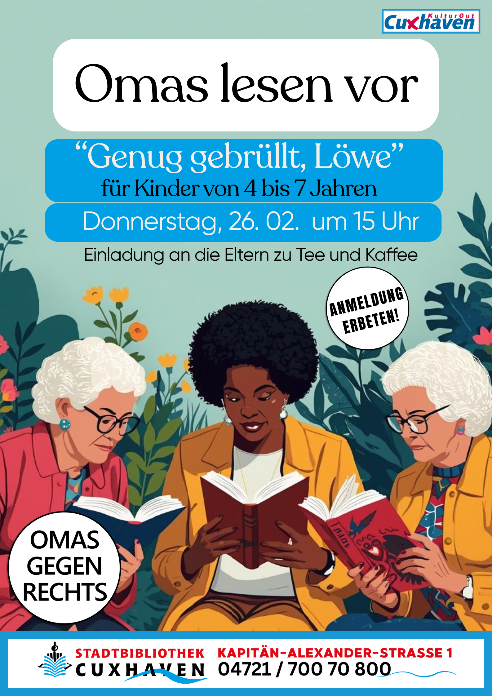 Die Veranstaltung „Omas lesen vor“ findet in Kooperation mit der Cuxhavener Gruppe „Omas gegen Rechts“ statt, die sich das Ziel setzt, auch Kindern auf spielerische Weise Themen wie Demokratie, Mitbestimmung, Gerechtigkeit und Ich-Stärke zu vermitteln und dabei gemeinsam Spaß an Büchern zu haben.